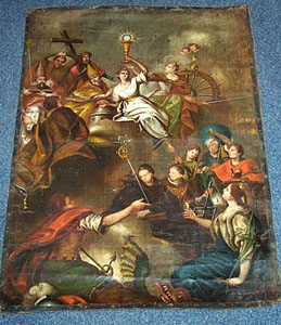 Sv. Cecílie, 85 x 64,5 cm, olej na plátně, signováno - F. Goya - vpravo dole - vyškrabáno a černě obtaženo černou barvou, za signaturou - nečitelná datace. Pozn. Jedná se o kvalitní dobový obraz, který byl odcizen, pozměněn a poté vydáván za dílo F. Goyi. Obraz je napnut na novém nekvalitním a neodborném blintrámu z měkkého dřeva. Na zadní straně dole vlevo je umístěno kulaté novodobé razítko. S velkou pravděpodobností se jedná o razítko se státním znakem. Vedle něj nápis propisovací tužkou - pravděpodobně Goya, čitelné pouze G. Vpravo od jména nečitelná datace. Pod nápisem Goya římská číslice XI.
