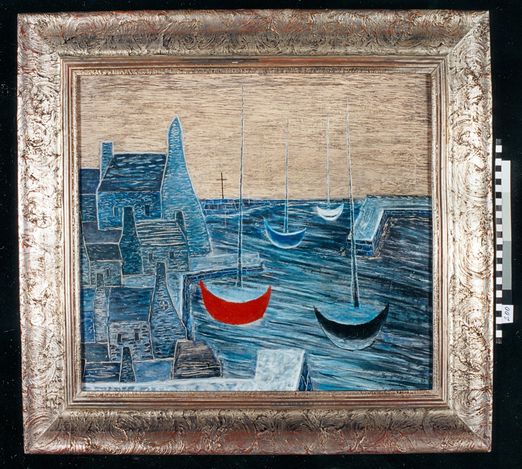 Lodě v Camaretu, rozměry – 50,5x60,5 cm, signatura umístěna vpravo dole „Zerzavý 34“, tempera na plátně, rám