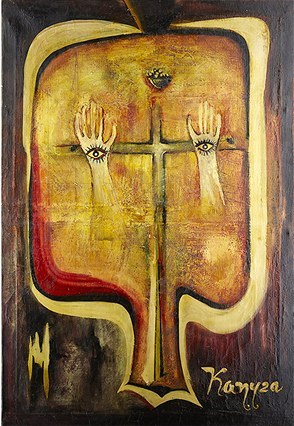 Figurální kompozice, 77 x 60 cm, Olej nebo akryl bez blindrámu na hrubém jutovém plátně s bílým podkladem. Vodorovné zlomy a zprohýbání plátna po bývalém stočení, signováno - Jan Trampota. Pozn. Malba je nedávného data. Jedná se o zcela bezcenné, velmi hrubé a diletantské falzum, momentálně na trhu dobře prodejného malíře.