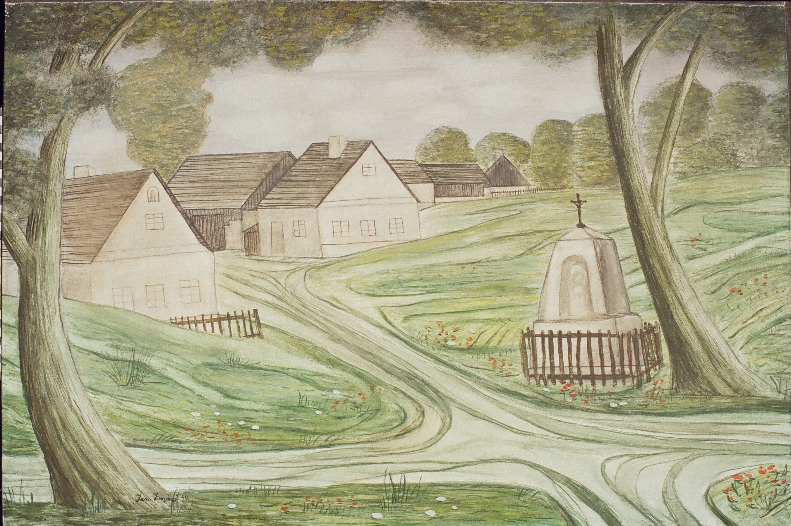 Kaplička u cesty, rozměry: 60 x 90 cm, technika: tempera na plátně, signatura: značeno vlevo dole Jan Zrzavý 40