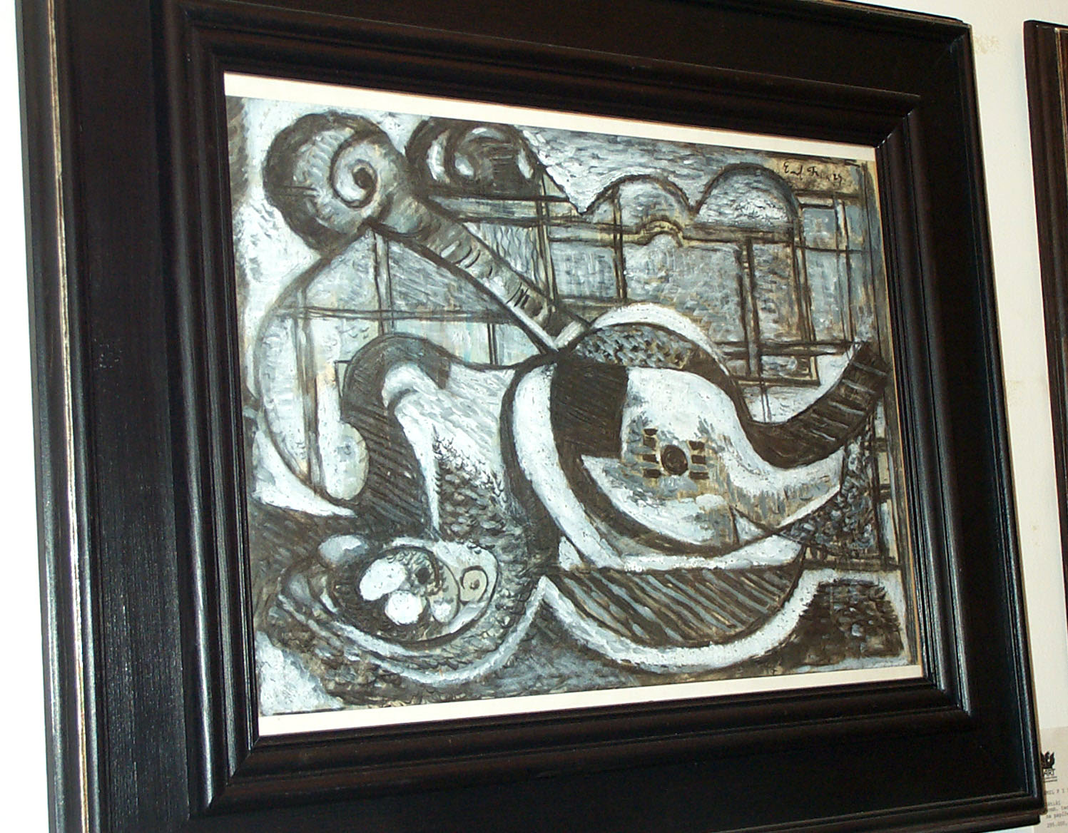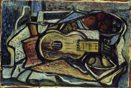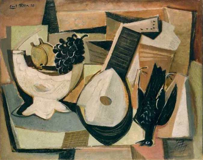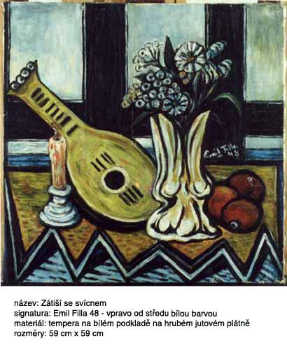 Zátiší s kytarou, 38 x 57 cm, Olejomalba na hrubém jutovém plátně bez blindrámu s hnědě natřenou spodní mezivrstvou. Barevná vrstva je vertikálně přelámaná (zřejmě byla předtím svinutá), hrubě nanesená, místy odpadlá až na plátno. V postranním osvětlení na RTG snímku se pod ní rýsují tahy malby spodní, která se liší, ale námět nelze rozpoznat,signováno - Emil Filla vpravo nahoře černou. Pozn. Malba je nedávného data. Jedná se o zcela bezcenné, velmi hrubé a diletantské falzum, momentálně na trhu dobře prodejného malíře.