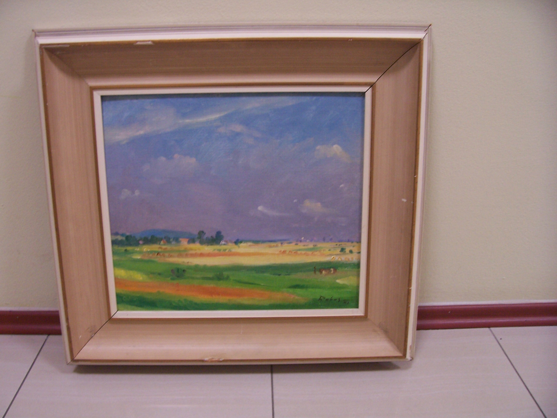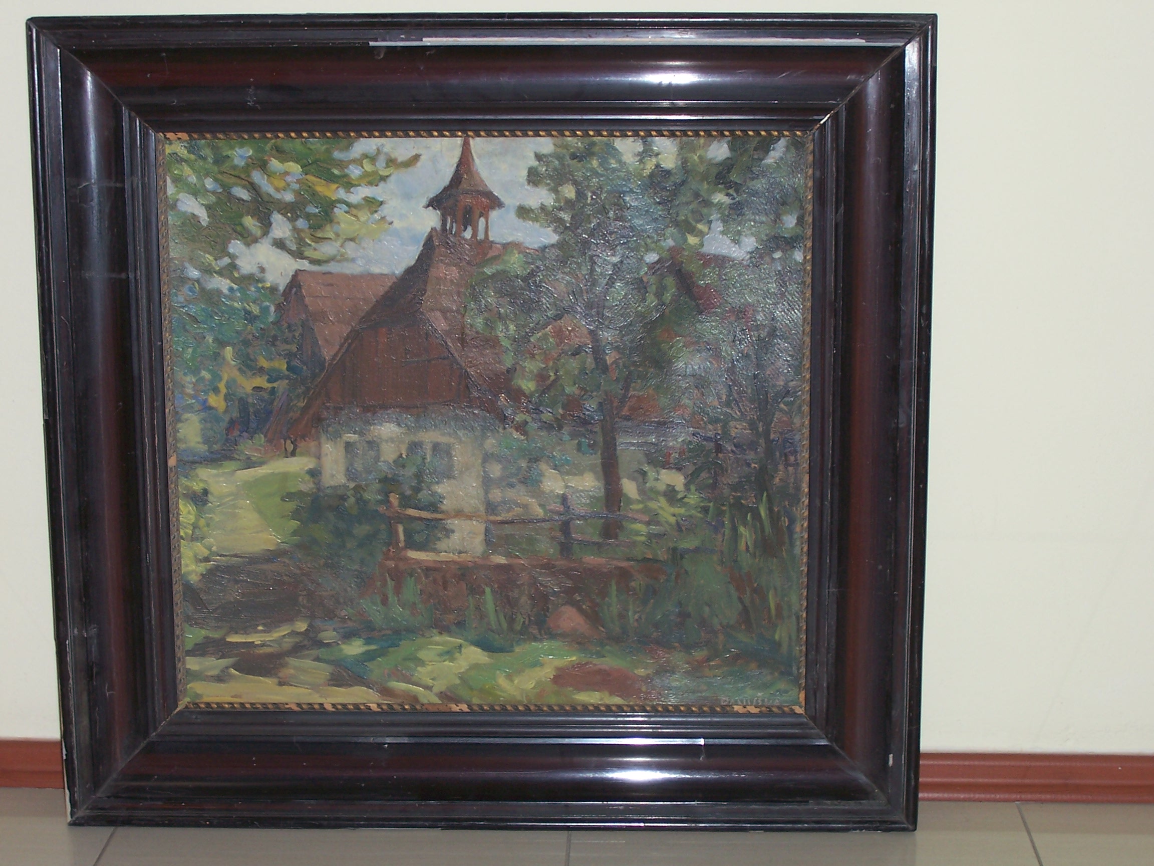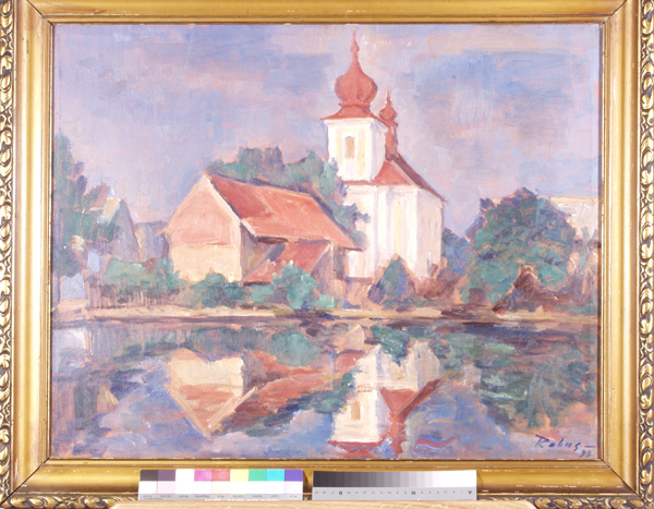 Kostelík, 56 x 70 cm, olej na plátně - rámováno, signováno - Rabas 33 - vpravo dole. Pozn. Podle znaleckého posudku Ing. Ivana Baťky se jedná o dílo Václava Rabase (nar. 1885), odhadní cena činí podle posudku 230.000,- Kč.