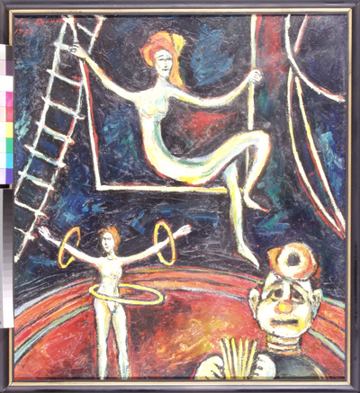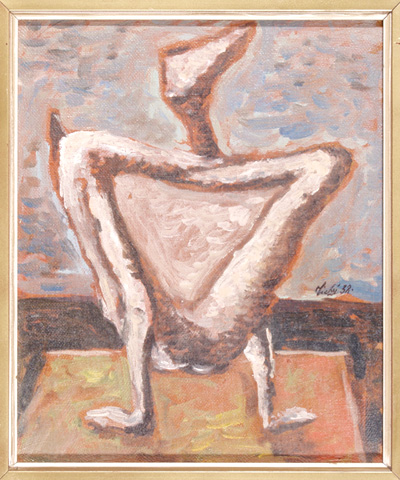 Akrobat, 30 x 26 cm,olej na plátně - rámováno, signováno - Tichý 38 - vpravo uprostřed. Pozn. Podle znaleckého posudku Ing. Ivana Baťky se jedná o dílo Františka Tichého (nar. 1896), odhadní cena činí podle posudku 75.000,- Kč.
