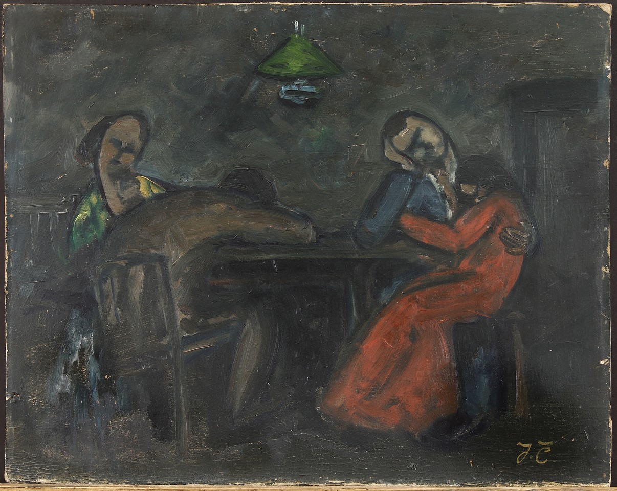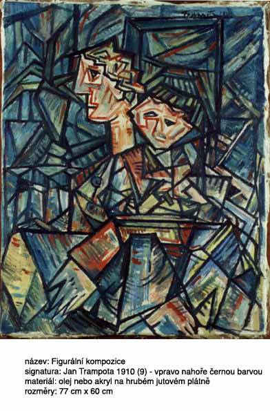 Figurální kompozice, 77 x 60 cm, Olej nebo akryl bez blindrámu na hrubém jutovém plátně s bílým podkladem. Vodorovné zlomy a zprohýbání plátna po bývalém stočení, signováno - Jan Trampota. Pozn. Malba je nedávného data. Jedná se o zcela bezcenné, velmi hrubé a diletantské falzum, momentálně na trhu dobře prodejného malíře.