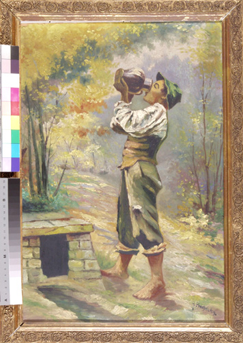 Chlapec u studny, 49 x 34 cm, olej na kartonu - rámováno, signováno - A. Procházka - vpravo dole. Pozn. Podle znaleckého posudku Prof. Dr. Miroslava Klivara CSc. - Masarykova Akademie umění, se jedná o dílo Antonína Procházky (1882 - 1945)