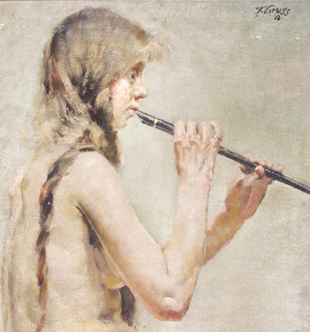 Hrající akt s píšťalou, 72 x 66 cm, olej na plátně - rámováno, signováno - J. Gruss - vpravo nahoře. Pozn. - Reprodukce díla je publikována v kalendáři firmy BASF jako dílo Jaroslava Grusse (nar. 1891)