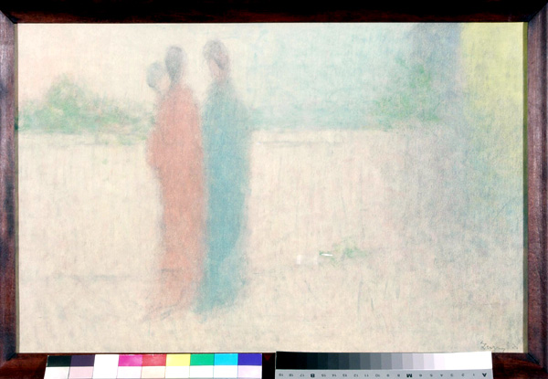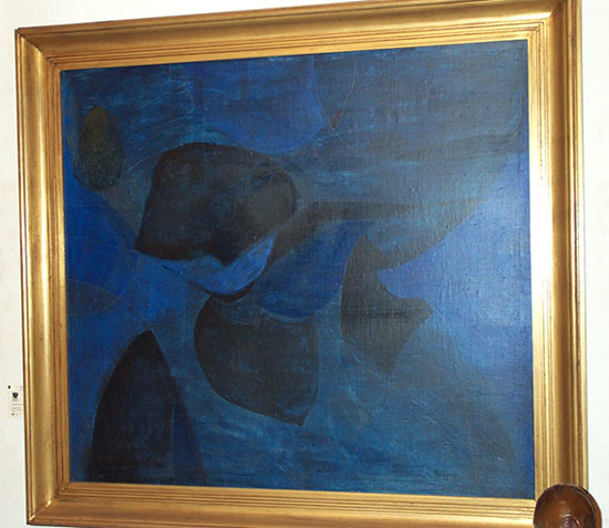 Ženy u klavíru, 49,5 x 89 cm, Olej na plátně, atypický bezklínový úzký blindrám je spojen klihem v rozích seříznutých na pokos. Na zadní straně se nacházejí 2 " Kramářova razítka", modré v šetihranném rámečku a zelené bez rámování. Malba má 2 vrstvy-malby. Spodní malba představuje vesničku pod horami s chaloupkami a plůtky v popředí, signováno - Picasso-vlevo dole, signatura je podtržená. Pozn. Obraz je mladým záměrným falzem se snahou napodobit Picassovo velmi ceněné kubistické období. Autor padělku pravděpodobně vycházel z obrazu George Bragua, nazvaného Portugalec, z roku 1911-12. Vyhotovení padělku je možné datovat do období mezi lety 1990-5.