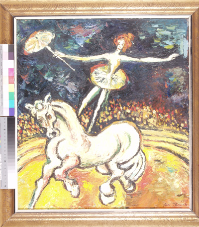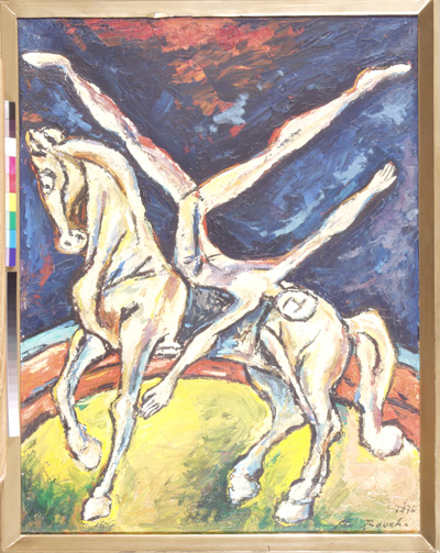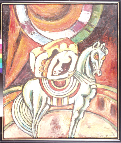 Krasojezdkyně, 56 x 50 cm, olej na plátně - rámováno, signováno - Jan Bauch 1975 - vpravo dole. Pozn. Podle znaleckého posudku Ing. Ivana Baťky se jedná o dílo Jana Baucha (nar. 1898), odhadní cena činí podle posudku 65.000,- Kč.