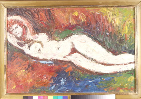 Ležící akt, 40 x 60 cm, olej na plátně - rámováno, signováno - Jan Bauch 1981 - vpravo dole. Pozn. Podle znaleckého posudku Ing. Ivana Baťky se jedná o dílo Jana Baucha (nar. 1898), odhadní cena činí podle posudku 93.000,- Kč.