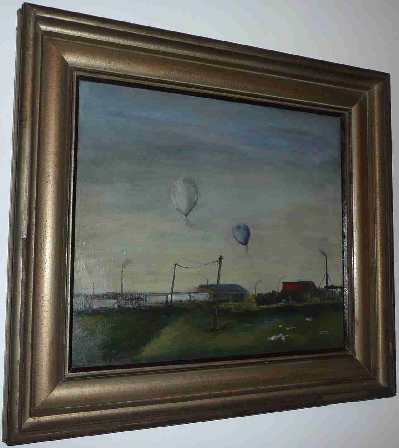 Dvě montgolfiéry, olejomalba na překližce, rozměry: 40x45cm, signováno vlevo dole Kamil Lhoták červeno - oranžově