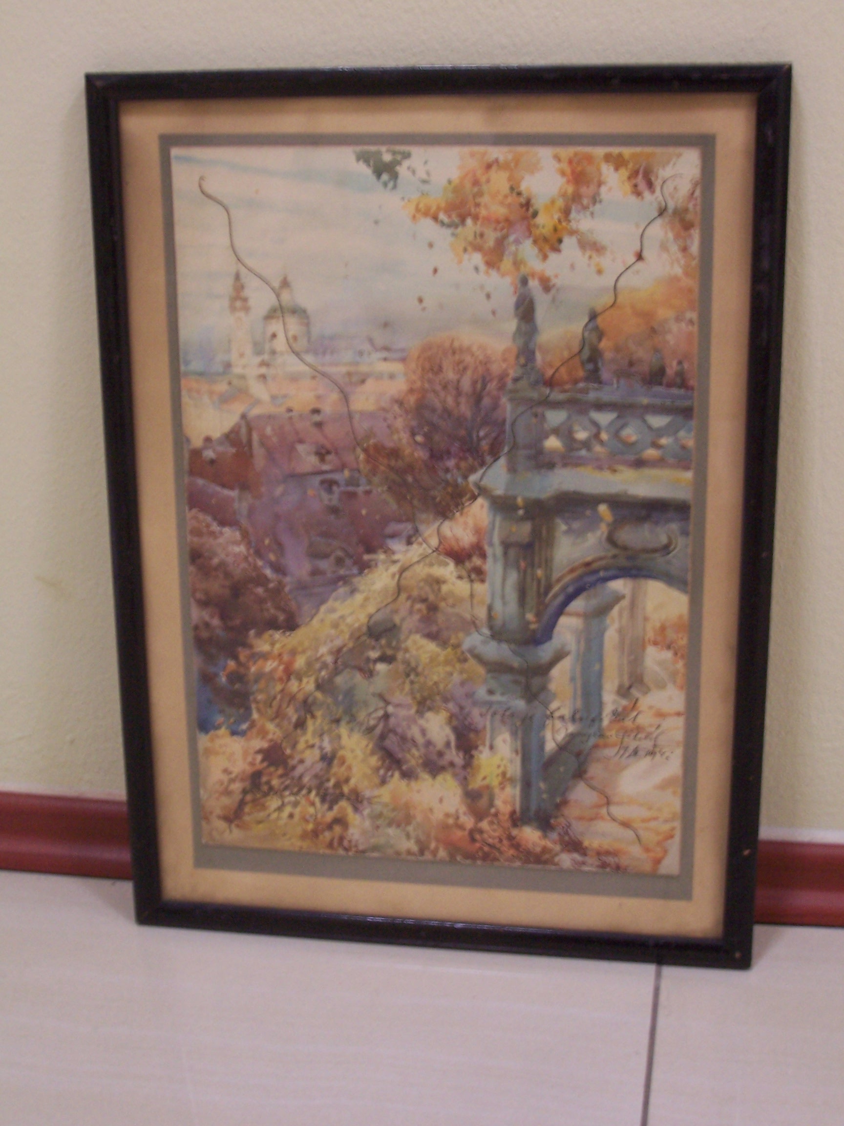 Ledenburská zahrada, rozměry 24x35cm, akvarel na kartonu, přeškrtnuto tuží a přípis:Toto je falzifikát-Jaroslav Šetelík 1942