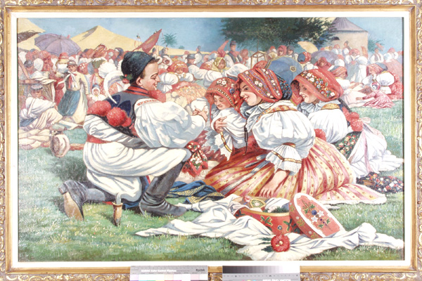 Slovácké slavnosti, 66 x 103 cm, olej na plátně - rámováno, restaurováno, signováno - J. Úprka 12 - vpravo dole . Pozn.- Podle znaleckého posudku Ing. Ivana Baťky se jedná o dílo Joži Úprky (1861 - 1940), odhadní cena činí podle posudku 280.000,- Kč. Reprodukce díla je publikována v kalendáři firmy BASF.
