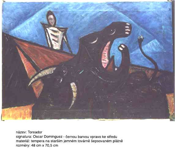 Toreador, 48 x 70,5 cm, Tempera na starším jemném továrně šepsovaném plátně. Pod současnou malbou se nachází další malba nebo dvě, které již byly krakelované. V posledním nánosu malby se krakely začínají kopírovat, malba se zvedá a místy již odpadla. Na RTG snímku nelze konkrétně rozpoznat spodní malbu, signováno - Domingues černou barvou vpravo od středu. Blintrám je starší, předtím použitý a kdysi obráceně pověšený, vzhledem k současné malbě. Pozn. Malba je nedávného data. Jedná se o zcela bezcenné, velmi hrubé a diletantské falzum, momentálně na trhu dobře prodejného malíře