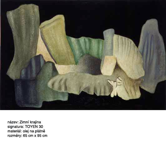 Zimní krajina, 65 x 95 cm, Olejomalba na plátně. Malba má bílý podklad olejovobílkovinovým pojidlem. Kompozice krystalů byla předkreslena tužkou.Struktura reliéfu malby nemá žádnou patinu a byla předmodelována bílou vápennou vrstvou(zrnka nejsou písek) a pak pokryta barevnými olejovými lazurami. Povrch obrazu je nalakován nažloutlým akrylovým lakem, signováno -TOYEN 30 černou barvou vpravo dole v malbě a krytá lakem. Pozn. Obraz je mladým novodobým padělkem vyrobeným podle předlohy a nemůže být v žádném případě dílem malířky TOYEN. Vznik obrazu je možno po chemickém rozboru barev stanovit na do období 1993 - 1999.