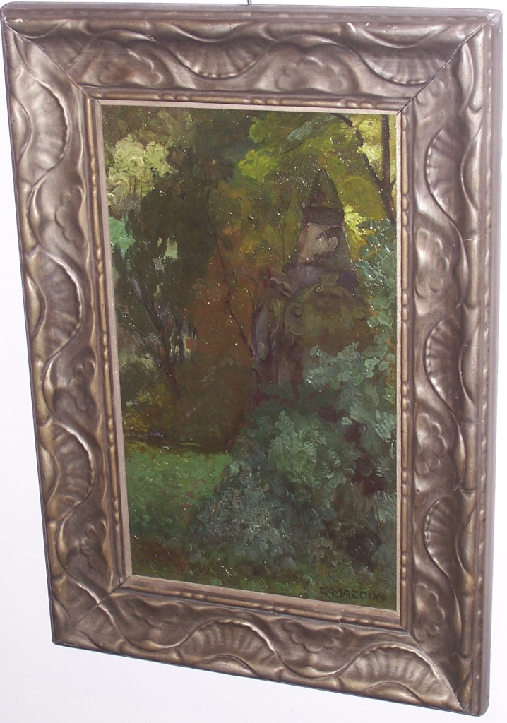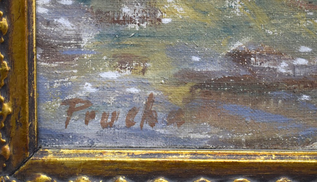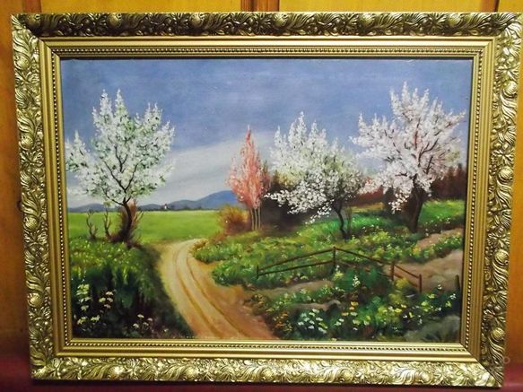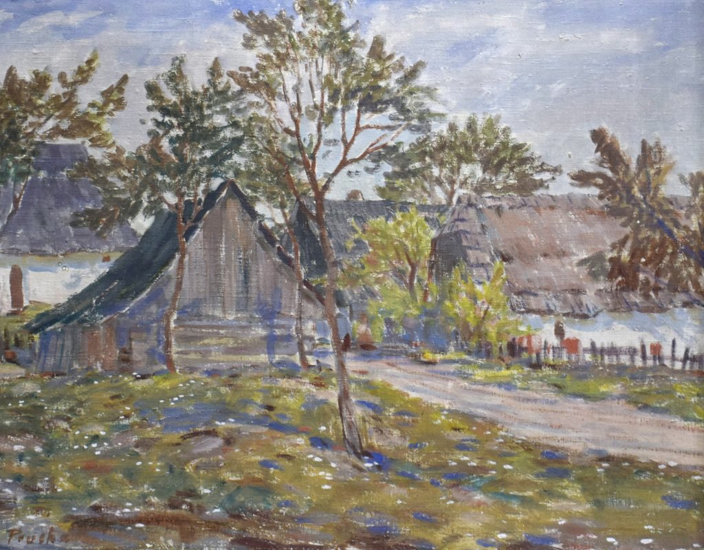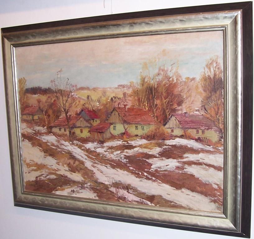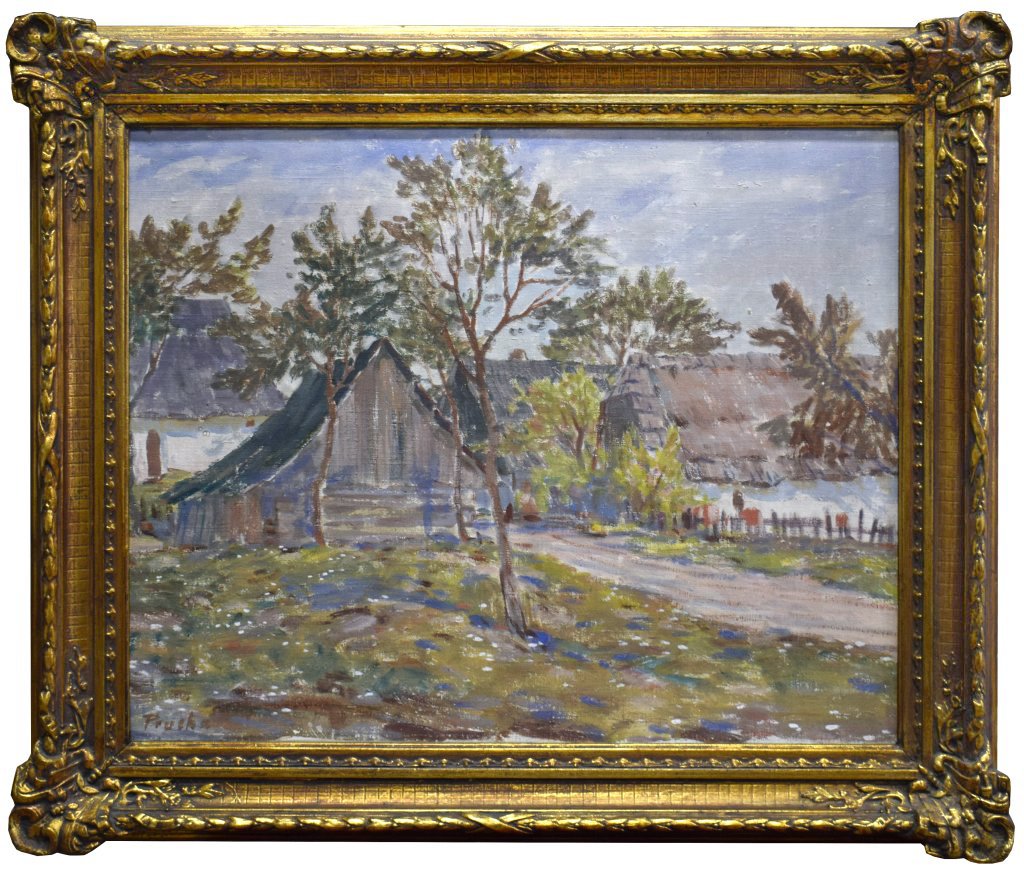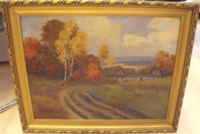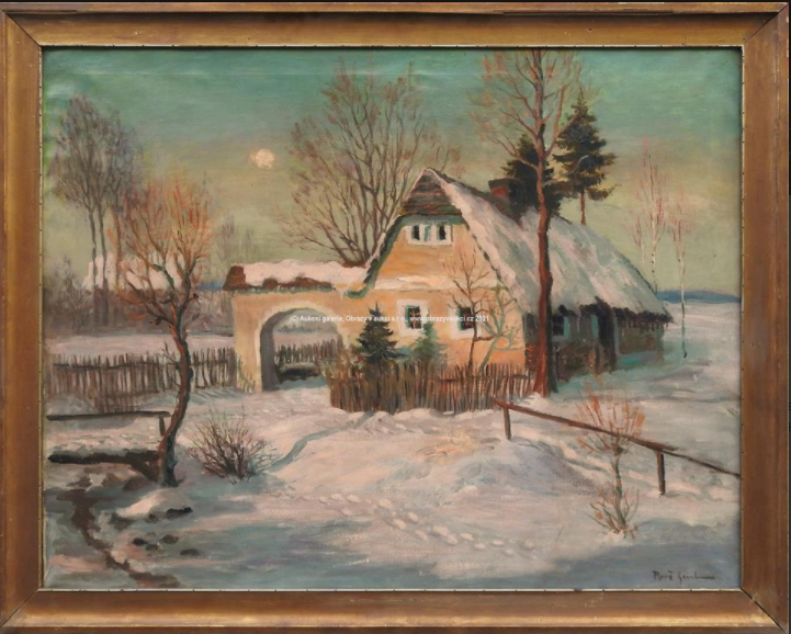 Název : Krajina s chalupou Technika : olej, lepenka Rozměr: 49,5 x 64,5 cm Značeno vlevo dole: O. Bubeníček |