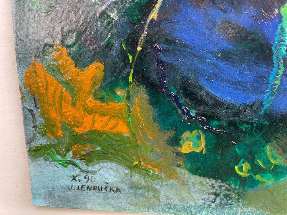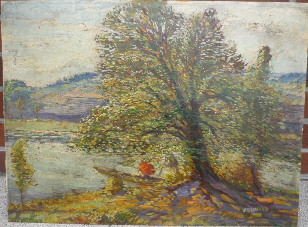 Autor : Josef Jíra (1929 - 2005) ? Název : Krajina se pstruhy Technika : olej, plátno Rozměr : 74 x 95 cm Značeno značeno vpravo dole : J. Jíra 69; na rubu autorsky: J. Jíra |